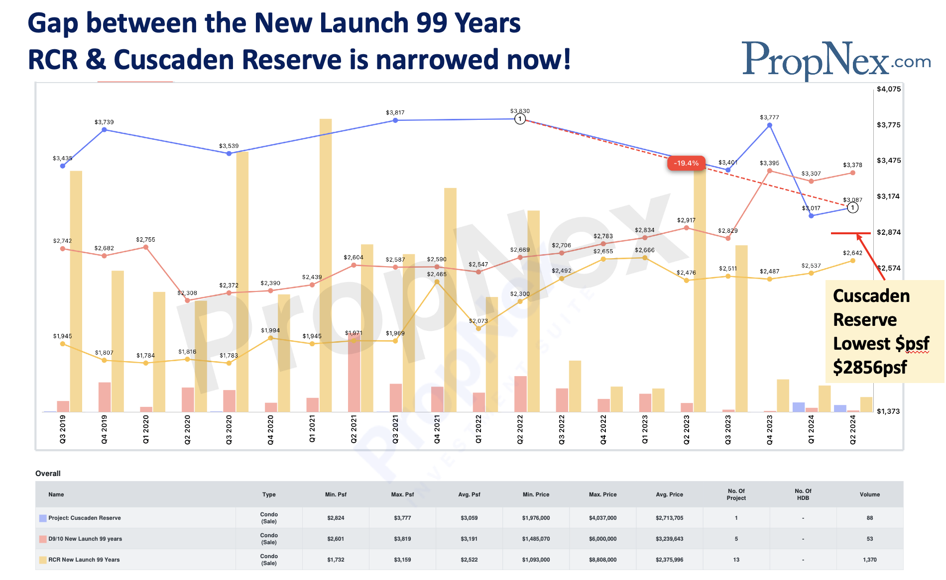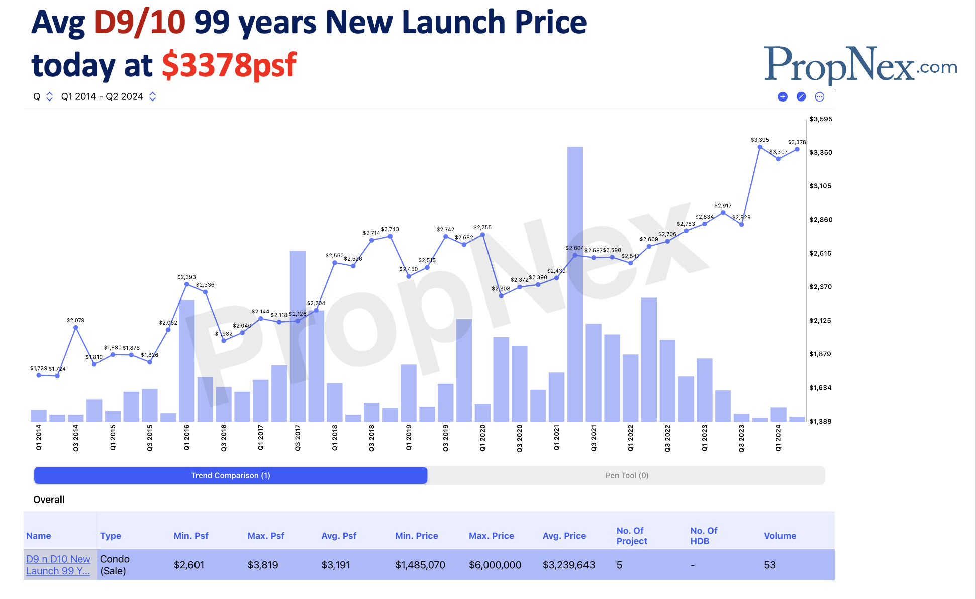 And if we were to look specifically at 99-year new launches in Districts 9 & 10, they all average at $3,378 psf.