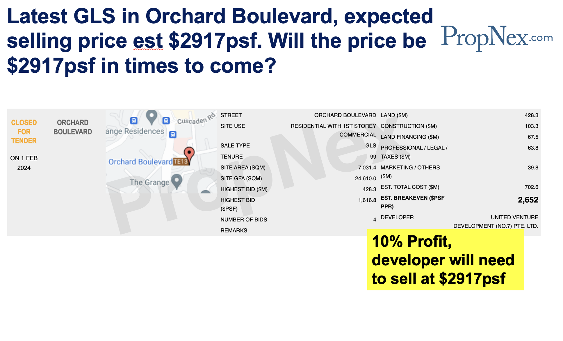 In one of the latest GLS exercises, the plot of land at Orchard Boulevard would have to be sold at $2,917 in order for the developer to make a 10% profit. So with rising construction costs, how much do you think this project would eventually be priced at?