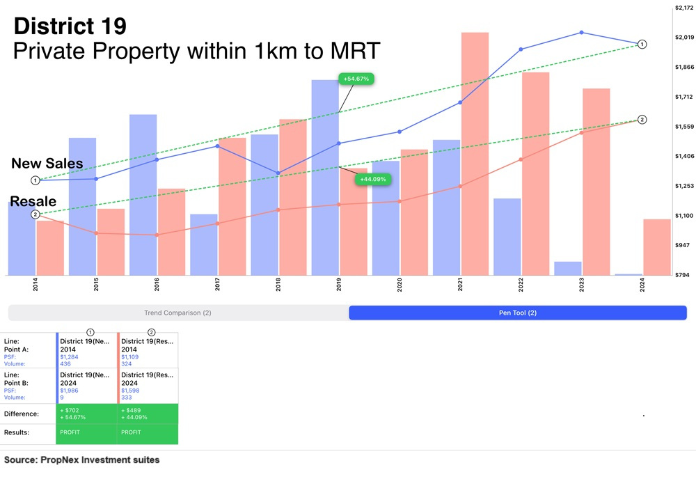 1. ** Historical Price Trends:** Looking at the historical price trends, property prices in District 19 have shown consistent appreciation over the past decade. Both new and resale properties have experienced significant increases in price per square foot. This historical data indicates the potential for substantial returns on investment.